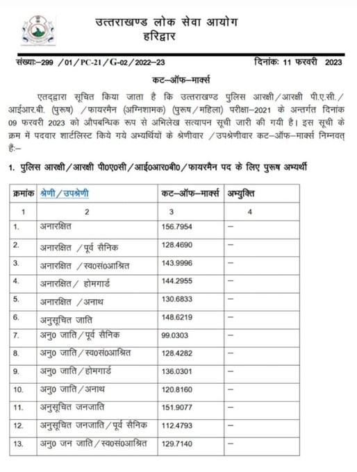 देहरादून – उत्तराखंड में बेरोजगारी प्रदर्शन के बाद अब एक के बाद एक भर्ती के साथ रिजल्ट और अब कट ऑफ लिस्ट जारी हो गई है. जी हां, आपने बिल्कुल सही पढ़ा….. अभी तक उत्तराखंड पुलिस कांस्टेबल परीक्षा कट ऑफ लिस्ट category-wise देखने को मिल रही है. जिसमें परीक्षा विभाग के द्वारा उत्तराखंड पुलिस कांस्टेबल परीक्षा का आयोजन सफलतापूर्वक पूरा करवा लिया गया है. यदि आपने अभी तक लिस्ट नहीं देखी है तो तुरंत देखें—