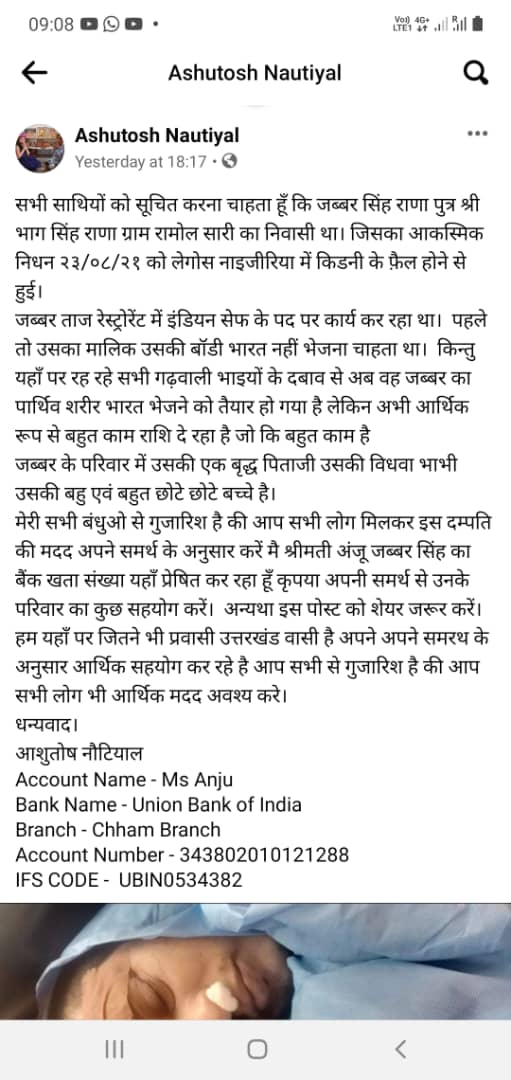 जबर सिंह पुत्र श्री भाग सिंह निवासी ग्राम रमोल सारी पट्टी नगुण तहसील कंदीसौड़ वि०ख०थौलधार जनपद टिहरी गढ़वाल (उत्तराखण्ड) नाइजीरिया स्थित Taj Restorent 18-Ade Akinsanya Avenue off town planning llupeju Logos में कार्यरत थे, दिनांक 24 अगस्त, 2021 की रात्रि को अचानक उनका स्वास्थ्य खराब होने के कारण उनका आकस्मिक निधन हो गया है। जबर सिह के आकस्मिक निधन के उपरान्त उनके परिवारजनों द्वारा उनका पार्थिव शरीर अपने गाँव लाये जाने हेतु नाइजीरिया स्थित उक्त होटल एवं नाइजीरिया सरकार से सम्पर्क स्थापित किया परन्तु उनके द्वारा स्व० जबर सिंह के शरीर को भारत वापस भेजे जाने में असमर्थता व्यक्त कर दी गई है । मृतक जबर सिंह के परिवारजनों की आर्थिक स्थिति कमजोर होने के कारण स्वयं के संशाधनों से वे मृतक का शरीर भारत वापस लाने में असमर्थ है जिस कारण उनके द्वार मृतक का शरीर वापस लाये जाने हेतु सरकार से अनुरोध किया गया है।