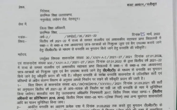 देहरादून- उत्तराखंड में शिक्षा महकमे से आज की बड़ी खबर है कि सभी राजकीय एवं अशासकीय सहायता प्राप्त विद्यालयों में कक्षा 1 से लेकर कक्षा 6 तक अध्ययनरत छात्र छात्राओं को निशुल्क जूता एवं बैग उपलब्ध कराए जाने के लिए डीबीटी के माध्यम से धनराशि भुगतान करने के लिए स्वीकृति प्रदान की गई है वित्त नियंत्रक विद्यालयी शिक्षा उत्तराखंड मोहम्मद गुलफाम अहमद ने सभी जिला शिक्षा अधिकारियों को निर्देश जारी किए हैं।