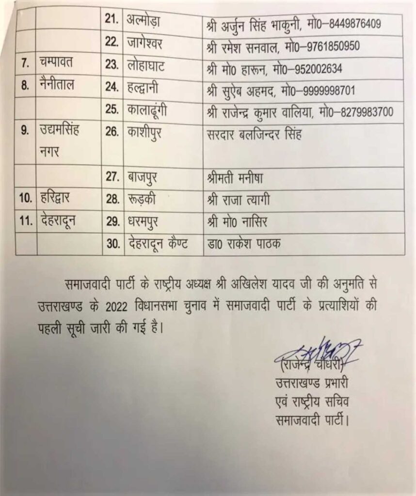 देहरादून- उत्तराखंड में समाजवादी पार्टी ने 30 विधानसभाओं में अपने प्रत्याशियों की पहली लिस्ट जारी कर दी है हल्द्वानी से शोएब अहमद को अपना प्रत्याशी बनाया है इसी तरह 30 विधानसभाओं में अपने प्रत्याशियों की लिस्ट जारी की है नीचे देखिए पूरी लिस्ट
